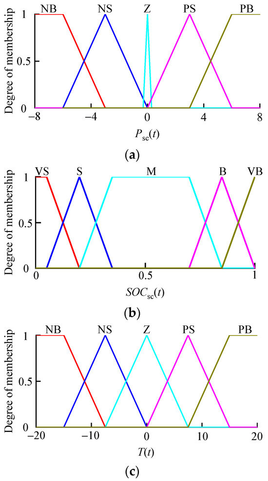 The upper limit of T is set to 20 in this paper, which means that the filter can pass fluctuating power with a frequency less than 0.008 Hz. In order for T to represent the direction of power change, T is signed and it will take an absolute value before being passed to the LPF. Seven fuzzy sets (negative big (NB), negative middle (NM), negative small (NS), zero (Z), positive small (PS), positive middle (PM), and positive big (PB)) are selected to cover the interval [−20, 20]. The membership function of FSFC comprises triangular and trapezoidal membership functions. The membership and control rule of the FSFC are shown in Figure 10 and Table 12, respectively. The value of is 0.12 s.