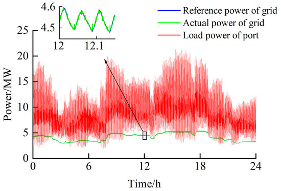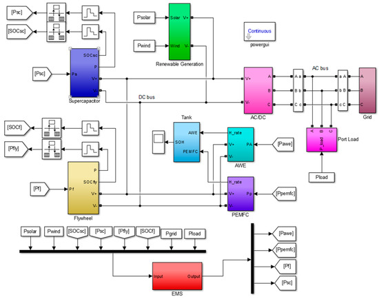 Obviously, the green port multi-energy microgrid system is mainly composed of the renewable energy generation system, hybrid energy storage system, and port load. The renewable energy generation system consists of a photovoltaic and wind power generation system. The hybrid energy storage system consists of a supercapacitor, flywheel, and hydrogen energy storage system (composed of an electrolytic cell, hydrogen tank, and fuel cell). The main port load consists of a quay crane, yard crane, and a ship. The renewable energy generation system and hybrid energy storage system are connected with the DC bus. The port load and grid is joined to the AC bus. The DC bus and AC bus are connected through AC/DC converters and transformers. The EMS obtains the output power of the renewable energy generation system (), the port load power (), and the reference power instructions given by the grid control center (), and then the EMS will output the power signal of the supercapacitor (), flywheel (), and hydrogen energy storage system (). can be separated into the power signal of electrolytic cell () and the power signal of the fuel cell () by the sign function. All power signals satisfy the following formula: