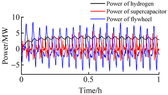 The hybrid energy storage power () is degraded into three parts: low-frequency power, medium-frequency power, and high-frequency power by dual LPF. The low-frequency part is allocated to the hydrogen energy storage system, the mid-frequency part is distributed to the flywheel, and the high-frequency part is distributed to the supercapacitor.