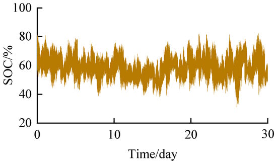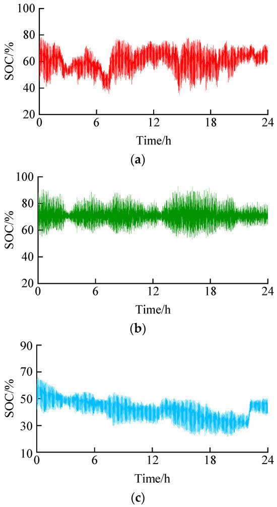 where is the pressure of the tank at time t; is the quantity of hydrogen inside the gas tank at time t; G is the gas constant; is the gas temperature; is the volume of the gas tank; is the value of the quantity of hydrogen at time ; is the efficiency of the electrolytic cell; F is Faraday’s constant (96,500 C/mol); is the efficiency of fuel cells; is the current of fuel cells; is the maximum pressure of the tank. Table 8 shows the parameter values of the hydrogen tank. To improve simulation speed, this paper sets the gas temperature of the hydrogen storage tank as a constant, which may cause changes in the capacity of the hydrogen storage tank in practical work. However, it does not affect the energy management strategy’s control of the SOC in medium- and high-frequency energy storage systems.