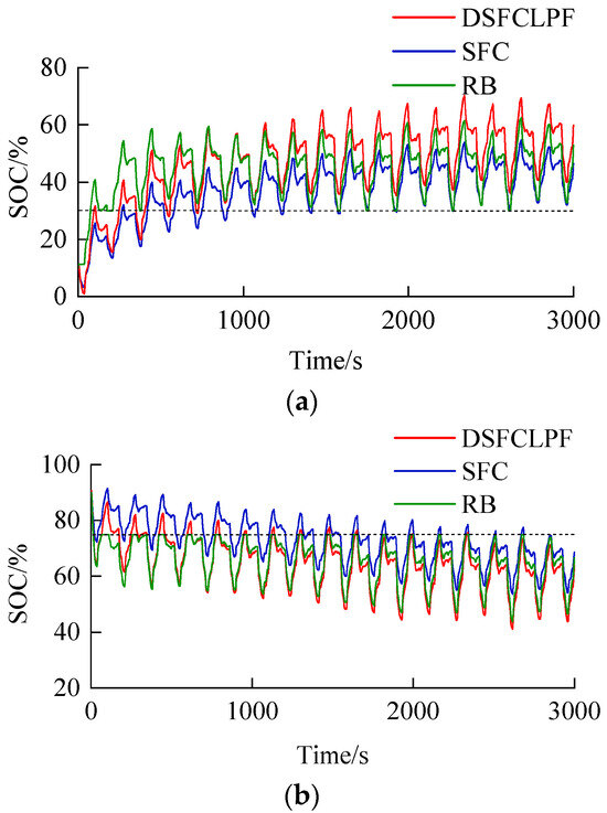 - Compared to fixed time constant LPF algorithms and wavelet packet decomposition algorithms, the energy management algorithm proposed in this paper changes the time constant of the LPF based on the alteration of power, which reasonably allocates the fluctuating power of the system and improves the operational efficiency of the hybrid energy storage system. When the SOC of the supercapacitor is large, if the supercapacitor is charging, reducing the power of the supercapacitor and adjusting the power of the flywheel is required. If the supercapacitor is discharging, it is not required to adjust the power of the supercapacitor.