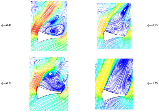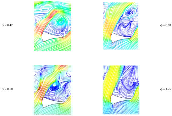 Figure 28 and Figure 29 show that the flow field streamlines at the 40% and 80% span locations, respectively. The flow field is highly three-dimensional, mostly separated on the suction side. At the 40% span location, beginning at a flow coefficient of 0.42, two large vortices are seen on the suction side of the turbine. As the flow coefficient increases, the vortices convect away from the blade. We observe a similar highly separated flow at the 80% span location. The comparison of the 80% and 40% spans reveals that the vortices have already moved away from the blade at the lowest flow coefficient (φ = 0.42) and advect away from the blade with an increasing flow coefficient. Additionally, we predicted a decrease in the velocity magnitude upstream of the leading edge. This decrease leads to an increase in the static pressure, thus increasing the pressure drop.