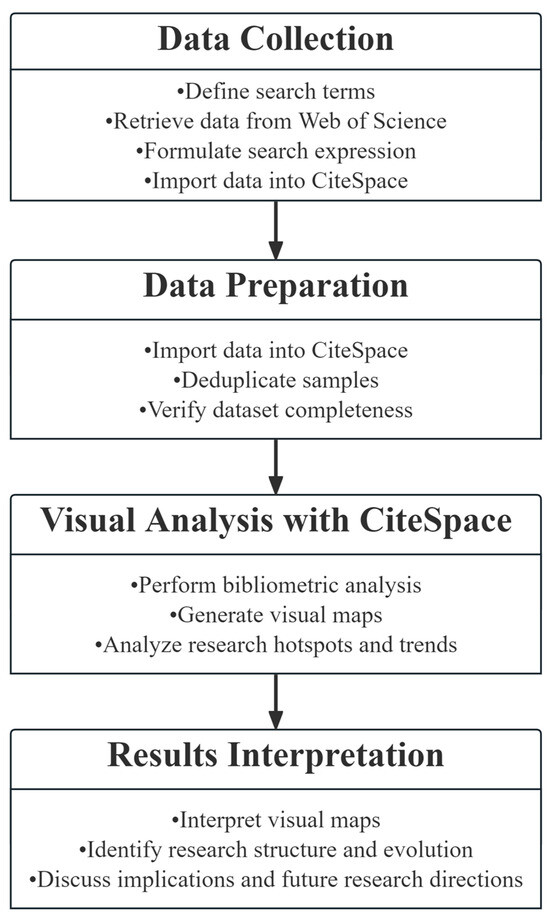 To ensure the quality and relevance of the collected data, we manually verify the search results. This involves checking for any irrelevant articles that may have been included due to overlapping terminology or ambiguous keywords. By refining the dataset through this verification process, we enhance the accuracy of our analysis. The comprehensive dataset is then structured and prepared for visual analysis in CiteSpace. The details of the search process, including the language, literature type, time span, and search results, are summarized in Table 1.