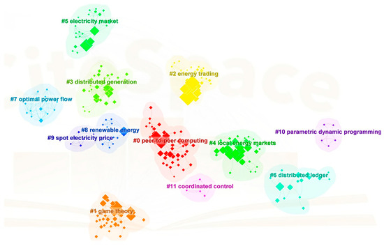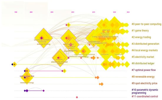 Utilizing the CiteSpace software, a Timeline visualization map of the research field about the power market and energy transactions was developed, building upon the foundation of Figure 8 (refer to Figure 9). To the right of Figure 9, 12 clusters are displayed, representing the diverse research directions that have emerged within this domain. From the keywords depicted in the map, it is discernible that based on prior studies, “peer-to-peer computing”, “local energy markets”, “energy trading”, “distributed generation”, “electricity market”, “distributed ledger”, “optimal power flow”, “renewable energy”, “spot electricity price”, “parametric dynamic programming”, “game theory”, and “coordinated control” have constituted the research frontier from 2020 to 2023. Through a meticulous review and analysis of 642 retrieved scholarly articles, in conjunction with a table of high-frequency keywords, the keywords in Figure 8 have been categorized into the following three research domains: smart grids, energy markets, and renewable energy technologies.