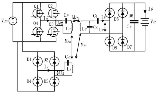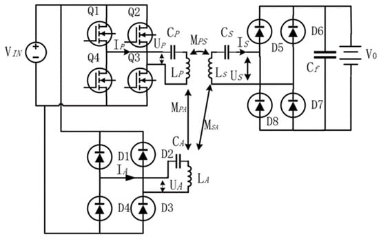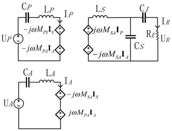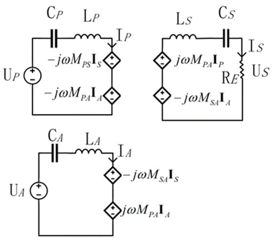 At present, the three-coil S (primary edge)-S (auxiliary)-S (secondary edge) topology circuit has appeared on the market; its circuit diagram is shown in Figure 1, and the equivalent circuit is shown in Figure 2. Where LP, LA and LS are the resonant inductors of the primary side, auxiliary side and secondary side, respectively, and CP, CA and CS are the resonant capacitors corresponding to the primary side, auxiliary side and secondary side MPS, MPA and MSA are the inductance between the primary edge and the secondary edge, the mutual inductance between the primary edge and the auxiliary clamp coil, and the mutual inductance between the auxiliary clamp coil and the secondary edge coil. RE is the value of the internal resistance of the battery, which will slowly increase with the increase in charging times and the increase in the internal charge state of the battery. When the resonant frequency of the primary side, auxiliary side, and secondary side coils reaches the same as the switching frequency, the circuit starts to resonate.