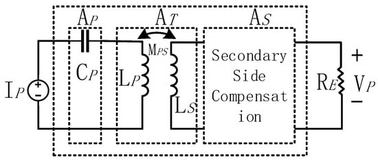As mentioned above, the auxiliary clamp coil has not been conducted in the initial constant current stage, and the whole IPT system can be simplified as an S-S topology circuit. When the recharging-battery resistance increases and reaches a critical value, the auxiliary coil is conducted and gradually transformed into constant voltage (CV) charging. In this process, the primary side circuit can be equivalent to the current source driving circuit in the series circuit, so the compensation should be placed in the secondary side coil. The two-port network is applied to analyze the S-S-PS system. The main circuit is equivalent to matrix A, the compensation matrix of the primary side circuit is AP, the transmission matrix of the primary and secondary side circuit is AT, and the compensation matrix of the secondary side is AS, as shown in Figure 3, while the corresponding relationship is Equation (6).