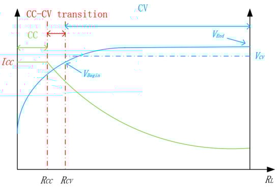 (1) After the intermediate transition state of constant current to constant voltage, the internal equivalent resistance of the battery gradually increases. When the internal equivalent resistance of the battery is , the integral diode flow bridge in the auxiliary clamp loop is fully conducted and the IPT system completely enters the constant voltage output state. Since the auxiliary coil is just conducting at this time, the current IA flowing through the auxiliary loop can be regarded as 0, which is much smaller than the current value I0 flowing through the battery. At this point, by putting Equation (29) into Equation (18), the battery load voltage at the beginning of the constant voltage stage can be obtained as follows.