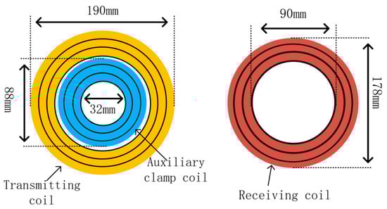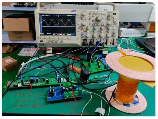 In view of the above theoretical research, a prototype platform for lithium battery charging is built in the laboratory, as shown in Figure 8, which charges the 48 V/20 Ah lithium battery load. The current on both sides of the load battery in the receiving loop is 2.5 A, and its constant voltage end voltage is set to Vend of 55 V in order to charge the battery at full capacity. The DC voltage on both sides of the inverter is 48 V, and the conduction ratio of four internal MOS transistors is 0.95 in half a cycle. According to the calculation in Section 4, the internal duty ratio of the inverter is 0.95 by applying dspIC30F4013 control, and the system operating frequency is 100 kHz. The S-S-PS three-coil coupling structure in the circuit is shown in Figure 9. In the circuit, IRFP460 is selected as the N-channel FET of the inverter circuit of this platform, and its drain can withstand the maximum load voltage of 500 V and the maximum load current of 20 A. The HBR20200 rectifier diode bridge was used for the auxiliary clamp side and the auxiliary side.