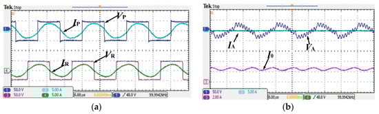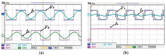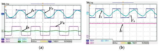 Figure 10 shows the waveform diagram of the system constant current output for battery charging. Where VP is the output voltage of the input voltage through the inverter circuit, IP is the output current of the inverter, VR is the output voltage of the secondary coil after the compensation topology, IR is the output current of the secondary side, VA is the induced accepted voltage of the auxiliary clamp side, IA is the internal current of the auxiliary clamp side, and IR is the charging current value of both sides of the battery. As shown in Figure 10, when the battery resistance at the internal load end of the system is equivalent to , obviously , the system is in constant current output mode at this time, and the output constant current supplies power to the battery. In this case, the voltage VA on the auxiliary clamp coil is always less than the DC voltage VIN at the input end. The rectifier bridge side is not conducted, and IA is 0, so the auxiliary side rarely interferes with the induced electromotive force of the primary and secondary sides. It can be seen from Figure 10b that the voltage VA on the auxiliary clamp coil fluctuates due to the induced current in the primary coil and secondary coil. At present, the whole IPT system can be regarded as the S-PS circuit topology, and the output continues to output a 2.5 A constant current. Although the IR current waveform fluctuates slightly, the overall output waveform is flat, which is roughly the same as the theoretical expected result. In the constant current charging mode, the output voltage VP of the inverter in the loop of the primary side coil is almost in phase with the current IP in the loop. As can be seen in Figure 10a, the inverter output realizes ZVS, reduces the reactive power circulation in the whole constant current output mode, and completes the predesigned ZPA.