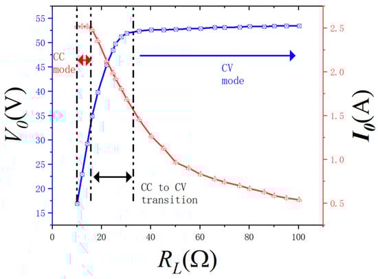 After fixing the internal parameters of the system above, is calculated as 17.25 Ω in the constant current output mode of the system by Equation (26) in Section 4 and is calculated as 22.1 Ω in the constant voltage output mode of the system by Equation (29). In the process of constant current charging, the voltage on both sides of the system load battery will gradually increase as the charging proceeds. When the voltage reaches a certain threshold, it will enter the transition state from the constant current mode and finally enter the constant voltage charging mode. In constant voltage mode, the system output current will gradually decrease with the increase in battery power. In the experiment, the equivalent constant current load of 10 Ω, the critical load of constant current to constant voltage transition of 20 Ω, and the load of 100 Ω after charging and full saturation in the constant voltage stage of the battery are selected to verify the output status under three different working modes.