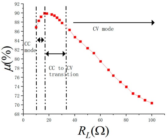 Figure 14 shows the dynamic curve of charging efficiency of the IPT system as the circuit equivalent resistance continues to increase. It can be seen from the measurement curve that the system efficiency is above 85% at the beginning when the resistance is small. When the equivalent resistance of the IPT system is around , the output efficiency of the system reaches up to 90.47%. As the charging continues, the equivalent resistance continues to increase beyond RCV and enters the constant voltage mode, the output current value gradually becomes smaller, and the absorbed power at the load end decreases. At this time, because the output current IP value of the inverter at the primary transmitting coil loop has been clamped by the auxiliary coil loop, the output power of the primary edge is constant, so the output power of the primary edge inverter is always higher than the accepted power at the load end. However, since the overall power should be kept constant, the higher part will flow back to the DC voltage source through the auxiliary coil loop, then into the IPT system through the primary side coil, and so on. As the charging continues, the inflow DC voltage power of the auxiliary loop gradually rises, but the current IA in the auxiliary loop keeps increasing because the DC voltage source VIN is fixed at 48 V. In the process of material selection, there is a certain internal resistance in the wire, so the increase in current will increase the internal loss power of the auxiliary coil. Further, the power re-entering the IPT system decreases and the final efficiency stabilizes at about 70%, which is the same as the efficiency range of the traditional constant current–constant voltage switching system. Therefore, the IPT system in this study has a high engineering application prospect.