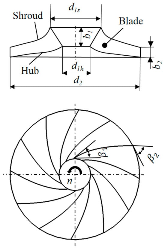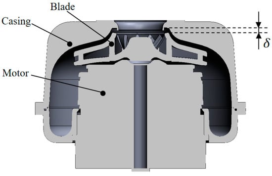 The object of this investigation is a centrifugal blower model (Figure 1). The main design parameters of the blower include the rated flow rate of 200 lpm (ANR), the rated pressure of 4000 Pa, and the rated rotating speed of 37,500 rpm. The impeller is a closed impeller composed of 12 blades with an upper and lower cover (Figure 2). The main parameters of the impeller include the inlet diameter d1, the outlet diameter d2, the inlet width b1, the outlet width b2, the inlet blade angle β1, and the outlet blade angle β2. The design dimensions of these parameters are listed in Table 1. The gap δ between the impeller and volute casing is adjusted by varying the installation height of the impeller. Considering the actual size of the blower, four schemes δ = 0, 0.4 mm, 0.8 mm, and 1.2 mm are investigated in this study, corresponding to 0 gap, small gap, medium gap, and large gap.