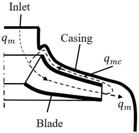 Figure 3 shows the occurrence of circulating flow in the impeller gap. A high-pressure zone is formed at the impeller outlet due to the high-speed rotation of the impeller, while a low-pressure zone is formed at the impeller inlet due to the centrifugal suction effect. The gap in circulating flow formed between the upper cover of the impeller and the volute casing is driven by the pressure difference at the inlet and outlet of the impeller. The actual flow rate inside the impeller is increased because of the additional flow rate of the gap recirculating flow. However, the total flow rate at the inlet and outlet of the volute casing is protected from the gap circulating flow. The inlet and outlet flow rate of the blower is represented by , the circulating flow rate within the gap is represented by , and the real flow rate inside the impeller is .