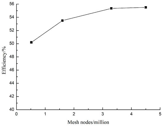 The mesh size has a significant impact on the accuracy of numerical calculations. To eliminate the effect of mesh size on the calculation accuracy, mesh independence verification was conducted. The mesh independence verification is shown in Figure 4, which was conducted under design flow conditions (0.004 kg/s). For the balance of calculation accuracy and computational resource consumption, 3.3 million mesh nodes were selected for calculation. The final mesh is shown in Figure 5 and Figure 6.