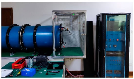 In order to verify the reliability of the numerical calculation, a comparative verification was conducted on the performance of the blower. The performance experiment of the blower was performed on a standard test bench in compliance with Air Motion and Control Association (AMCA) standard 210. The details of the test bench are shown in Figure 7. The testing platform is equipped with orifices of different sizes. The outlet of the blower was connected to the entrance of the testing platform. By switching the orifices, the pressure difference at the orifices was measured to calculate the flow rate. The pressure, flow rate, voltage, and current signals were recorded by a computer program for analysis and download.