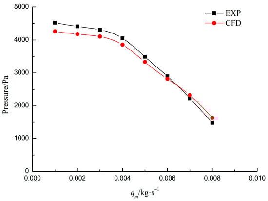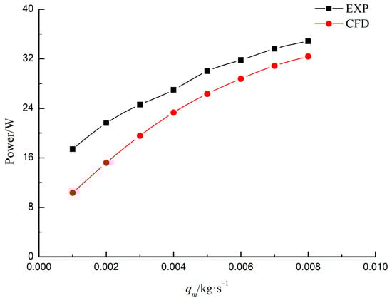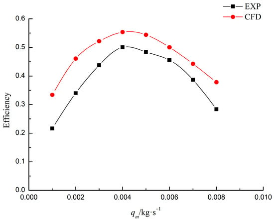 From Figure 8, it can be observed that the experimental data was in good agreement with the simulation data. The maximum relative error between the experiment and simulation is less than 5% at most operation points, and 5.8% only for the condition = 0.001 kg/s. Therefore, the simulation results can accurately predict the performance of the blower. From Figure 9 and Figure 10, it can be observed that when considering the motor heating power and bearing friction power, the simulated shaft power is about 15% lower than the experimental input power, and the total efficiency obtained from the experimental test is about 8% less than the simulated aerodynamic efficiency.
