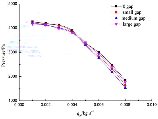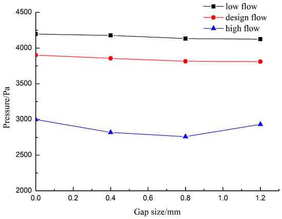 Figure 11 shows the P and Q curves of the blower with different gap sizes. It can be observed that the pressure of the blower is highest with no gap under all flow conditions. Between no gap and maximum gap (1.2 mm), the pressure drops by about 70~90 Pa. The pressure at the design flow point decreased by approximately 1.75~2.25% for all gap sizes. Figure 12 shows the pressure against gap sizes under different flow rate conditions. It can be observed that under low flow and design flow conditions, the pressure curve of the blower decreases with the increase in gap sizes. For high flow conditions, it can be observed that the pressure curve of the blower still decreases in small and medium gap sizes, but the opposite situation occurs in large gap sizes, where the pressure begins to rise and is nearly increased to that of no gap. This phenomenon indicates that in the case of large gap sizes, the internal flow of the blower has changed compared to small and medium gap sizes, which will be further analyzed in the following section.