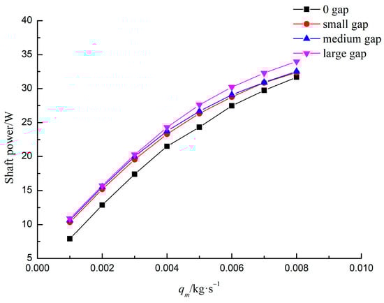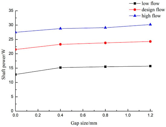Figure 13 shows the shaft power against mass flow rate with different gap sizes. From the figure, it can be observed that the shaft power increases with the increase in flow rate. Figure 14 shows the shaft power against the gap sizes under different flow rate conditions. It can be observed that the shaft power gradually increases with the increase in gap sizes. This is mainly because the gap flow rate increases as the gap size increases, thereby increasing the flow rate in the impeller and the shaft power. From Figure 14, it can be observed that the shaft power of the blower increases with the increase in gap sizes, whether under low flow conditions, design flow conditions, or high flow conditions. Compared to a 0 gap size, a large gap size (1.2 mm) will increase approximately 10~22% in shaft power under different flow conditions.
