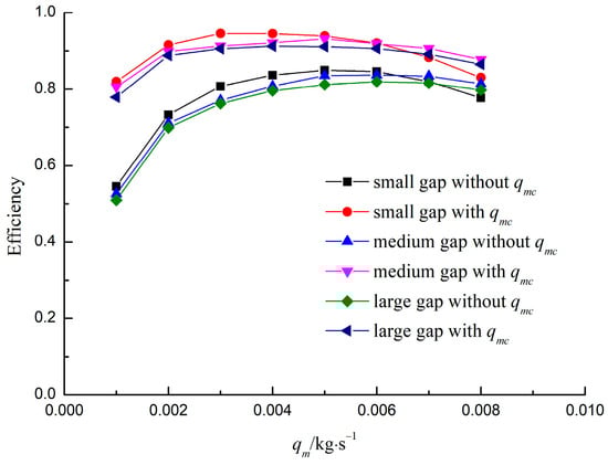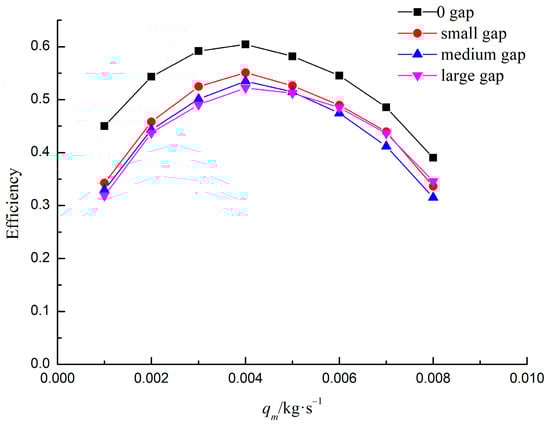 Aerodynamic efficiency of the impeller against mass flow rate with different gap sizes.