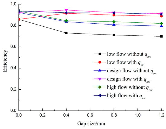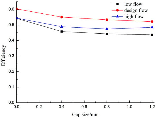 Efficiency of the impeller against the gap sizes under different flow conditions.
