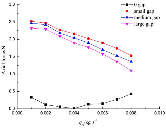 Figure 17 shows the axial force of the impeller against the flow rate under different gap sizes. The axial force of the impeller is obtained by integrating the pressure of the blade, upper, and lower covers in the axial direction. For the condition of a 0 gap, only the inside of the upper cover has pressure data, and the pressure on the outside of the upper cover is 0 due to the lack of a gap. It can be observed that the axial force of the impeller is all positive, indicating that the impeller is subjected to an axial force pointing towards the inlet of the impeller. The axial force of the impeller is very small for a 0 gap size, and the axial force of the impeller is almost zero under the design flow conditions. As the flow rate increases, the axial force first decreases and then increases. When there is a gap, the axial force acting on the impeller decreases with the increase in flow rate. The larger the gap, the smaller the axial force acting on the impeller. Under low flow rate conditions, the axial force of the impeller with a large gap is 93% of that with a small gap. Under design flow conditions, the axial force of the impeller with a large gap is 88% of that with a small gap. Under high flow conditions, the axial force of the impeller with a large gap is 83% of that with a small gap.