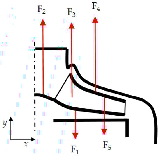 To further investigate the reasons for the differences in axial force curve trends, axial forces were classified into five components, as shown in Figure 18. It can be observed that both the impeller blades and the upper and lower cover plate walls are subjected to airflow pressure, resulting in axial forces. The axial force acting on the lower wall of the lower cover plate is named F1, while the axial forces acting on other walls are FT = F2 + F3 + F4 + F5. The total axial force is FA = F1 + FT. The values of F1, FT and FA are listed in Table 2. It can be seen that F1 decreases first and then increases, while FT decreases monotonically. When there is a gap, the increase rate of axial force FT is smaller than the decrease rate of axial force F1, so the total axial force decreases monotonically. When there is no gap, the increase rate of axial force FT is greater than the decrease rate of axial force F1, resulting in an increase in the total axial force. As a result, the axial force variation trend of the impeller without gaps is different from that with gaps.