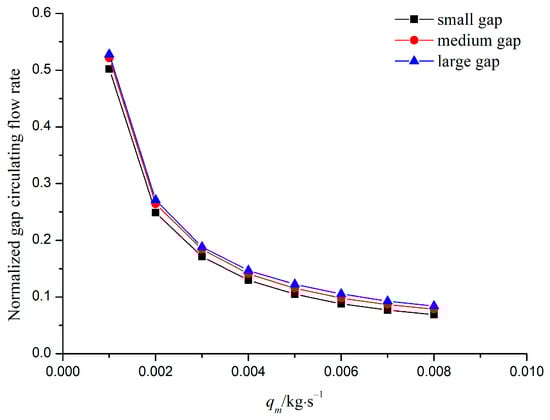 To better understand the gap flow rate, as it is closely related to the actual flow rate at the inlet, the gap circulating flow rate is normalized by the inlet flow rate of the blower. The curve of the normalized gap flow rate against the inlet flow rate of the blower is shown in Figure 23. From the figure, it can be observed that near the design flow point, the normalized gap circulating flow within the three gap sizes reaches about 12~15% of the inlet flow. Under low flow conditions, the normalized gap circulating flow within the three gap sizes can reach over 50% of the inlet flow. As a result, the circulating flow dominates the flow field under low flow conditions. The gap circulating flow leads to a significant increase in the flow rate of the impeller under low flow conditions, which indicates that the gap circulating flow has a significant effect on the flow structure of the impeller flow channel under low flow conditions, thereby having a significant impact on the performance of the blower. These results are also very close to the data from Fritsche [34], who provides a normalized gap flow rate of 7~10% at the design point with a radial gap of 2 mm~4 mm and an inlet diameter of 100 mm. Figure 23 shows that the gap circulating flow rate with different gap sizes remains at 6.8~8.4% of the inlet flow rate under high flow rate conditions.
