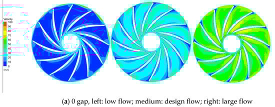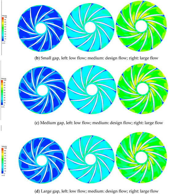 Figure 24 shows the velocity distribution of the impeller channel with different gap sizes under low flow conditions, design flow conditions, and high flow conditions. From the figure, it can be observed that under low flow conditions, the high-speed zone is mainly distributed on the pressure surface of the impeller for the 0 gap case. As the gap size increases, the flow rate in the impeller channel gradually increases, and the area of the low-speed zone gradually decreases. The high-speed zone near the suction surface of the impeller gradually expands, while the high-speed zone on the pressure surface gradually shrinks. In the presence of a large gap, the high-speed zone dominates the suction surface of the impeller. In contrast, the low-speed zone dominates on the pressure surface, which is opposite to the velocity distribution in the impeller channel of the 0 gap case. Under high flow conditions, the high-speed zone of the impeller channel is mainly distributed near the suction surface of the impeller for the 0 gap case. As the gap size increases, the high-speed zone shifts towards the pressure surface of the impeller.