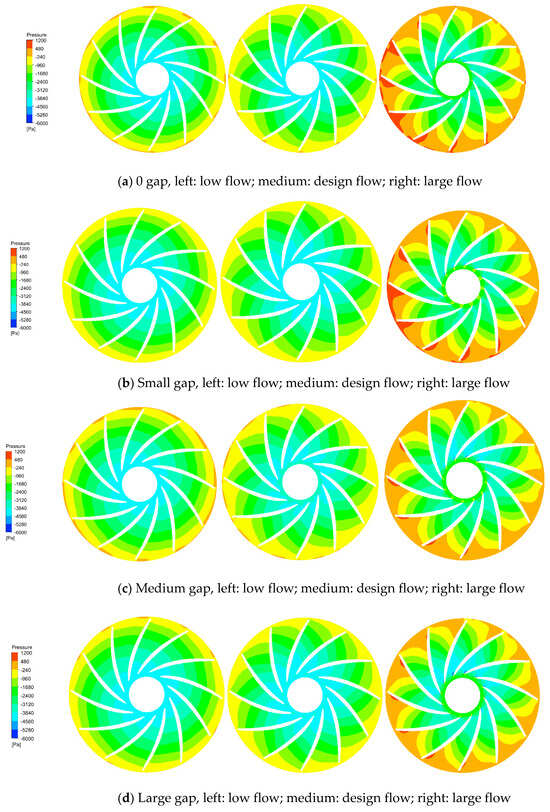 Figure 25 shows the pressure distribution of the impeller channel with different gap sizes. Due to the centrifugal effect of the high-speed rotation of the impeller, the pressure distribution in the impeller channel gradually increases from the inlet to the outlet. As the flow rate increases, the low-pressure area inside the channel begins to contract towards the leading edge of the impeller on the pressure surface or expand towards the trailing edge of the impeller on the suction surface. The pressure gradient on the blade pressure surface gradually increases, while the pressure gradient on the suction surface gradually decreases. Under high flow conditions, uneven pressure distribution is generated in the impeller channel for the 0 gap condition, and some high-pressure zones are generated in the lower left corner. However, as the gap size increases, the gap flow rate increases, and the uneven pressure distribution in the impeller channel improves.