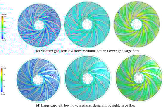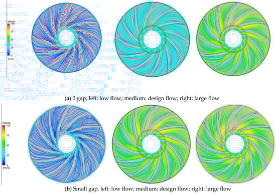 Figure 26 shows the streamline distribution in the impeller channel with different gap sizes. It can be observed from the figure that when there is no gap, in the case of small flow, the mass flow rate in the impeller channel is low, and the kinetic energy of the fluid microelements in the boundary layer is not enough to overcome the increase in external pressure. So, there is a serious flow separation in the impeller channel, which mainly occurs on the suction surface of the impeller, and there are single or multiple vortexes in the impeller channel. The vortex is fully developed at the position of the impeller near the tongue of the volute casing, where the scale of the vortex is the largest, occupying about 80% of the impeller channel. The flow channel away from the volute casing is less affected by the vortex, and the separation flow mainly occurs near the leading edge of the suction surface. It occupies about 40% of the impeller channel. Under design flow and large flow conditions, the flow separation in the impeller channel has been improved, and the flow separation mainly occurs near the trailing edge of the suction surface. With the effect of the gap flow, the flow separation in the impeller channel under small flow conditions is obviously inhibited. Only near the leading edge of the impeller is there a vortex caused by a small range of flow separation. The high-energy fluid in the gap flow re-enters the impeller inlet, which supplements the mass flow rate of the impeller under small flow conditions and inhibits the flow separation phenomenon caused by insufficient fluid speed in the impeller channel. This is consistent with the efficiency curve of the impeller under small and medium-flow conditions in Figure 20. Under small flow conditions, due to the replenishment of gap circulating flow, the efficiency of the impeller is higher than that of the 0 gap. At the same time, it can be observed that the streamlines of the impeller channel are relatively smooth with a small gap size under small flow conditions. When the gap size increases, the streamlines in the impeller channel are distorted, indicating that the large gap circulating flow mixed with the mainstream makes the flow in the impeller channel unstable (the flow in the red dotted circle). This will lead to a decrease in the efficiency of the impeller channel, which is consistent with the trend of gradual decline in the impeller efficiency with the increase of the gap size under small flow conditions in Figure 20. Under the design flow and large flow conditions, the flow separation near the trailing edge of the suction surface gradually expands with the increase in gap sizes, resulting in a decrease in impeller efficiency with the increase in gap sizes.
