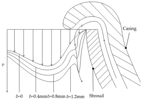 Nowadays, it is possible to conduct more detailed research on the impact of gap circulating flow due to the rapid development of computer technology. High-performance computing resources can be used to perform a comprehensive simulation of the internal flow, which allows many variations to be simulated and evaluated. Thus, a deeper understanding of the gap flow can be obtained. For voluteless centrifugal fans, as clarified by Hariharan and Govardhan [9], increasing the gap width worsens the blade aerodynamic performance. Yu [10] et al. quantitatively analyzed the effect of the gap between the impeller and inlet on fan performance. The internal flow of a centrifugal fan (d2 = 0.8 m, n = 960 rpm) under gap conditions of 0 mm, 2 mm, and 2.5 mm was numerically investigated. It was found that a 2 mm or 2.5 mm gap would lead to a decrease in efficiency of 1.2% or 1.8% compared with the ideal design. Lee [11] et al. analyzed the flow in the inlet gap of a fan and found that, due to the pressure difference between the inlet and outlet of the fan, the airflow recirculating to the inlet became a local jet, causing flow separation at the shroud. Later studies further demonstrated this effect [12,13,14,15], where the streamlines diagram shows that the jet flow generated from the inlet gap generates a recirculating flow, which is around the intersection of the shroud and the blade trailing edge. The flow separation carries strong turbulent kinetic energy (TKE) [16,17]. Additionally, as shown in the experimental results [18,19], the shape of the shroud cannot be completely designed in streamline, which will generate a reverse pressure gradient in the internal flow of the impeller, leading to flow separation. It should be noted that the skin friction on the shroud wall has the effect of increasing the rotational momentum of the fluid near the wall [20]. The same results were also found in [21]. This effect is significantly different from traditional blade vortex interactions (e.g., [22]), in which the flow upstream of the blade is stationary. Nagae [23] investigated the improvement of the gap flow in a centrifugal fan using LDV and found that adding rib structures to the inlet nozzle resulted in a reduced gap flow rate, correspondingly higher efficiency, and less fan noise. The above study has conducted extensive research on the inlet gap flow of centrifugal fans without volutes, but the influence of volutes on gap flow is still unknown.