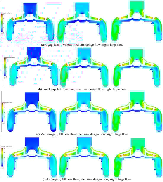 Figure 29 shows the absolute flow velocity distribution of the blower section with different gap sizes, with the left side of the figure showing the outlet of the volute casing. It can be observed that the flow velocity gradually increases to its maximum from the inlet of the blower to the outlet of the impeller and progressively decreases within the volute casing. The kinetic energy of the velocity is gradually converted into pressure potential energy. The high-speed airflow flows out from the impeller outlet and directly impacts the inner wall of the volute casing. The airflow flows to the bottom of the volute casing and then returns to the volute chamber. There is a strong mixing effect of high-speed and low-speed airflow inside the volute casing, so the energy loss inside the volute casing is relatively large. By analyzing the velocity of the impeller under different flow conditions, it can be observed that the velocity of the impeller outlet is relatively uniform in the direction of blade height under low flow conditions. Under design and high flow conditions, high-speed airflow is mainly concentrated at the upper and lower covers of the impeller. The velocity at the middle position of the blade is relatively low. For the flow condition with a gap circulating flow, it can be observed that the high-speed airflow at the impeller outlet directly enters the gap flow channel, and the flow velocity inside the gap flow is relatively high. Under low flow conditions, the high-speed fluid adheres to the vicinity of the upper cover of the impeller after the circulating flow in a small gap reaches the inlet of the impeller, while the circulating flow in medium and large gaps, due to the high velocity, clearly shows jet flow effects at the gapping mouth when flowing to the inlet of the impeller. The gap circulating flow deviates from the upper cover for a certain distance and is then brought into the impeller channel by the mainstream. Under both design flow and high flow conditions, jet flow effects can still be observed, but their intensity is much weaker than that of low flow conditions.