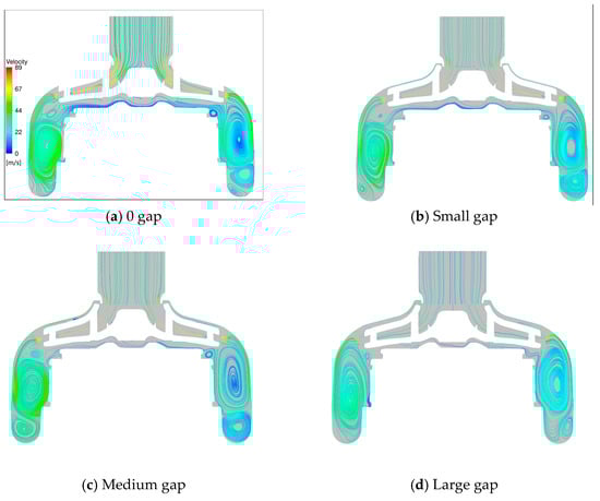 Figure 30 shows the streamline of the blower with different gap sizes under extremely high flow conditions (0.008 kg/s), with the left side of the figure showing the outlet of the volute casing. It can be observed that the stream flows downward along the volute wall after exiting the impeller outlet. Two large vortexes formed below the volute casing. It can be observed that a large vortex is formed near the outlet side of the blower under the condition of 0 gap flow, occupying the entire volute flow channel. Below the impeller outlet, a smaller vortex is formed due to the strong shear effect of the high-speed stream at the impeller outlet. On the right side, three small vortexes are generated in addition to the large vortex formed by the airflow impact. These vortexes are the main source of energy loss within the volute casing. A small vortex begins forming at the bottom of the volute on the outlet side (left side) of the blower under a small gap condition, forming three vortexes in total that exacerbate energy loss. Moreover, the small vortex at the bottom of the outlet side becomes larger under medium gap conditions, further exacerbating energy loss. However, the vortex near the outlet side of the blower returns to a large vortex with a distribution similar to that of the vortex under 0 gap conditions, and the scale of the vortex on the right side of the volute decreases. Together, these lead to reduced energy loss inside the volute. This is also consistent with the efficiency trend under the extremely high flow condition with the large gap in Figure 15.