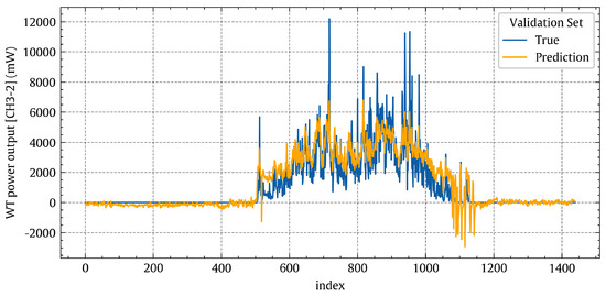 Temporal patterns of the true power output [CH3-2] values (blue line) and the corresponding predicted values (orange line) for the deep learning model on the validation set.