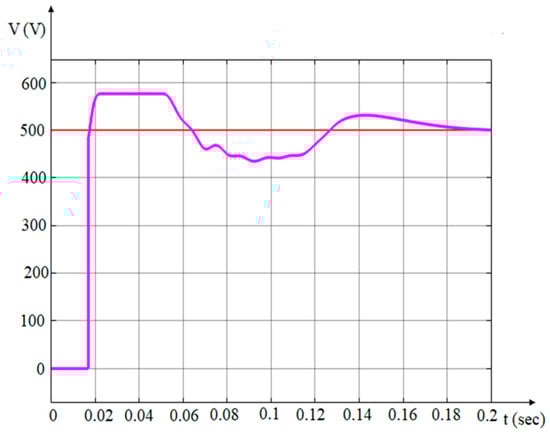 The parameters used in the grid-connected PV solar system are given below. (L1 = 5 mH, C1 = 100 µF, R1 = 0.005 Ω and C2 = 24,000 µF). The efficiency of energy production in PV solar systems depends on meteorological conditions such as irradiation and ambient temperature. Park et al. [22] have studied prediction of solar irradiance and photovoltaic solar energy product based on cloud coverage estimation using machine learning methods. In conditions with low solar irradiation values, the efficiency of PV solar panels in generating electricity decreases [23,24]. This is due to the reduced amount of solar irradiation reaching the surface of PV panels. The solar inverter input voltage waveform is illustrated in Figure 4.