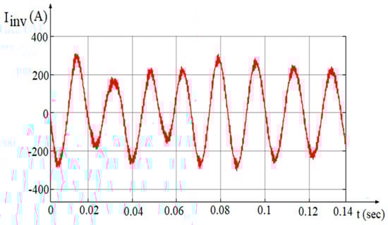 The use of solar systems is increasing due to their low fuel and maintenance costs and their environmentally friendly nature. However, it is worth noting that the efficiency of PV panels decreases as ambient temperatures rise. In grid-connected PV solar systems, the AC/DC rectifiers and DC/AC inverters used are sources of harmonic components that can reduce the quality of energy delivered to consumers [25,26,27]. Solar inverters typically use pulse-width modulation (PWM) techniques to convert DC power from solar panels into AC power, which can introduce harmonics into the grid due to rapid changes in voltage and current. Additionally, interactions between the inverter and the grid can cause harmonics due to impedance mismatches, resonance phenomena, or disturbances in the grid voltage [26,27,28]. The solar inverter output current waveform is shown in Figure 5.