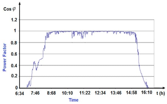 It is essential to measure the power factor in a grid-connected PV solar system to ensure efficient operation and compliance with grid codes and standards (Figure 6). Power factor can be measured using a power meter or a power quality analyzer, which typically measures voltage, current, real power, and reactive power to calculate the power factor [36,37,38]. The measurement equipment is usually installed at the point of common coupling (PCC), where the system connects to the grid, allowing for the measurement of the power factor at the interface between the PV system and the grid [39,40]. The equipment may include data logging capabilities for continuous monitoring of power factors over time. These data can be used to identify trends, diagnose issues, and ensure compliance with grid codes. It can also be analyzed to assess the performance of the PV solar system and identify areas for improvement. If the measured power factor falls below acceptable limits set by grid codes or standards, corrective measures may need to be taken, such as adjusting system parameters or installing power factor correction equipment. The change in power factor values throughout the day is given in Figure 6.
