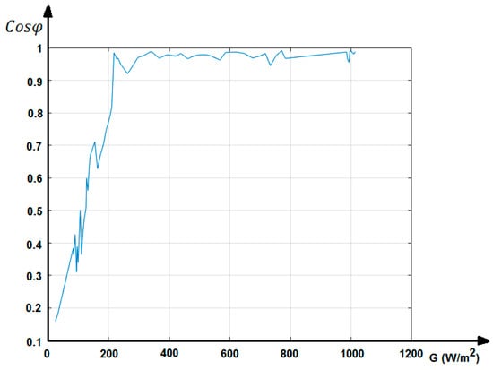 The power factor is a significant factor in determining the quality of a grid-connected PV solar energy system. The power factor in solar energy systems needs to be close to one in terms of energy quality. As the importance of renewable energy sources continues to grow, monitoring the power factor variation throughout the day in a grid-connected PV solar system becomes crucial to ensure efficient operation and compliance with grid regulations. Inverters often come with built-in monitoring capabilities to track power factors and other performance parameters. The change in power factor depending on solar irradiation values in a grid-connected PV solar system is illustrated in Figure 8.