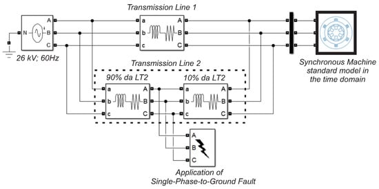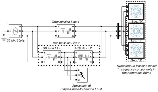 In this section, we present a comparison of simulations between the standard time-domain model and the model developed in Section 2.2 for synchronous machine components in harmonic sequence. The test system (Figure 1) consisted of a synchronous machine connected to an infinite bus via two transmission lines. A single-phase-to-ground fault was simulated, lasting 200 ms, occurring along the length of transmission line 2 from the infinite bus. Figure 2 depicts the system using the synchronous machine model in harmonic sequence components, where each synchronous machine represents a harmonic in the rotor reference, as determined by the equations for each of the model developed in Section 2.2.