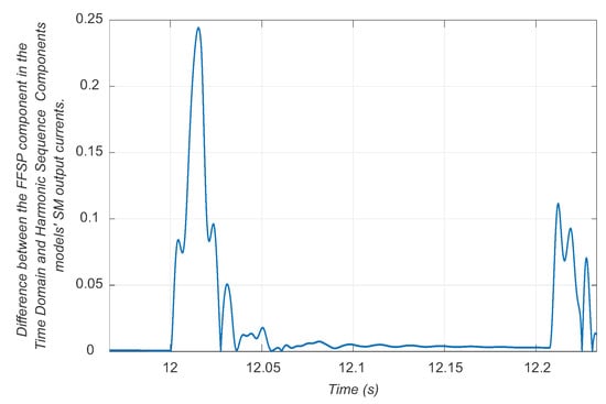 Difference between the FFSP component in the time-domain and harmonic sequence models of the SM output currents in p.u.