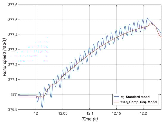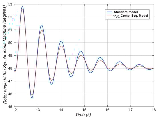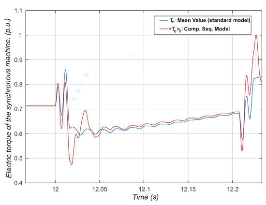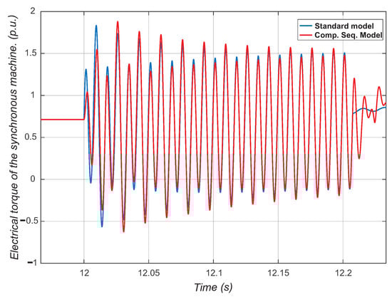 In Figure 6, the electrical torque curves between the standard model and the sequence component model during the disturbance are compared. Similar to the currents, the torque exhibits very close behavior, except for the first two cycles of the transient. This difference, although considerable (since the results are per unit), does not significantly impact the rotor angle oscillations. It is worth clarifying that the electrical torque curve in the harmonic sequence component model was constructed from three values: , , and . The equations corresponding to the harmonic degree torques are not shown, but were considered in the simulations (to obtain these equations, substitute the value of in Equation (22)).