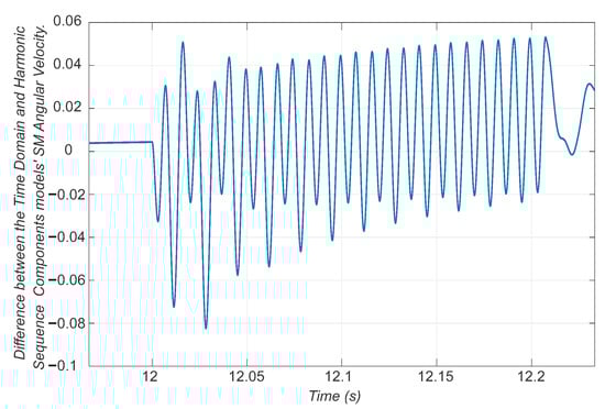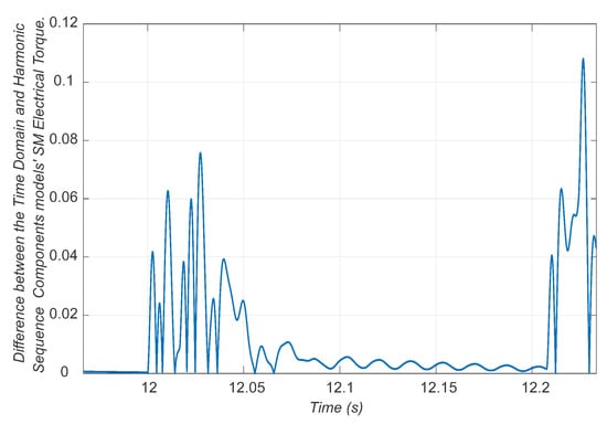 Similar to the analysis of the SM output currents, the difference between the electrical torque curves of the standard model and the harmonic sequence model is shown in Figure 7. The maximum difference between the two models is 0.08 p.u. during the transient when the fault is applied and 0.15 p.u. when the fault is cleared.