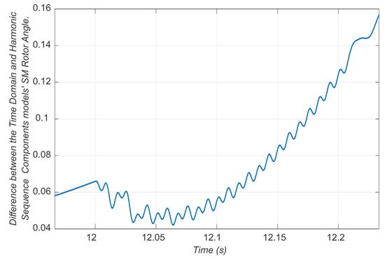 From the comparison of Figure 3 and Figure 4, it can be observed that the behavior of the synchronous machine’s output currents is identical during pre-fault steady-state operation. During the disturbance, the behaviors are very close, except for the first two cycles of the transient when the fault is applied and when the fault is cleared. This difference is shown in Figure 5, where the maximum difference between the two models is 0.25 p.u. However, this difference does not significantly affect the rotor angle excursion, as is observed in the following.