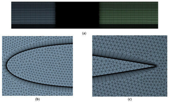 In the axial direction, the domains extended upstream and downstream were chosen at 4C and 6C, respectively. A uniform velocity profile was specified for the inlet boundary condition, while static pressure was imposed at the outlet. Additionally, no-slip wall boundary conditions were applied to the blade surface, hub, and tip. In the computational domain, lateral faces were specified with periodic boundary conditions. As observed from the inlet, the turbine rotates anticlockwise at 2000 rpm. A Moving Reference Frame (MRF) was employed to realize the rotation of the rotor blades. In this case, the air was used as the working fluid, with the buoyancy effect not being considered. The boundary conditions and details of the meshing are presented in