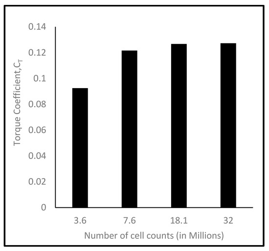 Grid independence is essential to ensure accurate results in numerical analysis. Therefore, meshes with different cell sizes were used as the starting point for studying grid dependency. The numerical and experimental torque coefficient for all meshes was compared at . Notably, the torque coefficient for the coarse grid (3.6 million cells) was significantly lower than that for the medium grid (7.6 million cells).