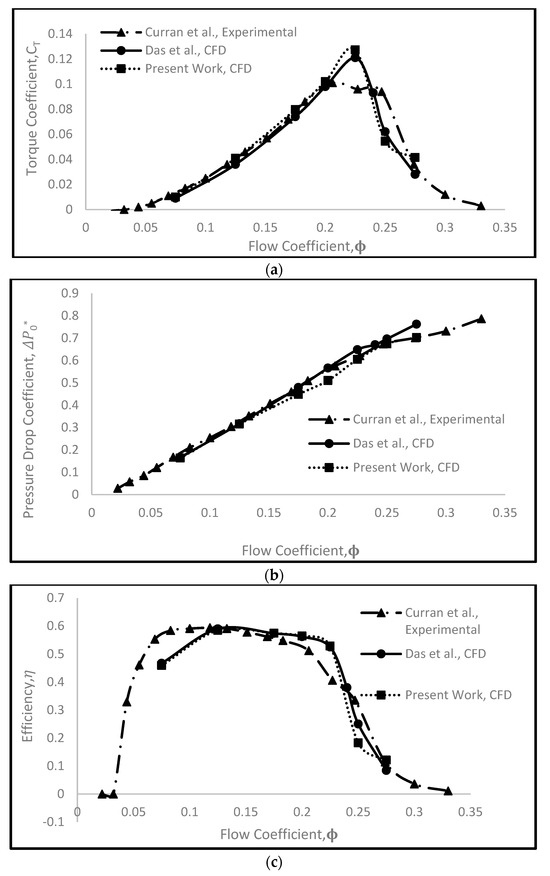 A constant rotational speed of 2000 rpm was used in this study; however, different axial inlet speeds were used to assess the effectiveness of the turbine. In this case, flow coefficients,