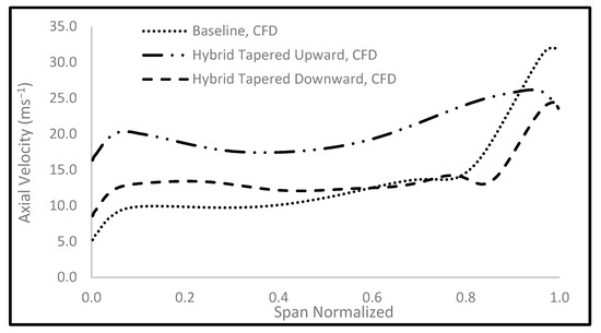 , for all the turbine designs. As axial velocity decreases in the vicinity of the blade tip, the relative velocity and α at the blade’s leading edge are lower in the variable chord rotor designs than in the constant chord turbines. The blades’ leading edges thus experienced more uniform axial velocity distribution. In addition, the hybrid tapered downward design is superior to the hybrid tapered upward design, as the axial velocity of the latter was higher throughout the span, which resulted in the early separation and stall.