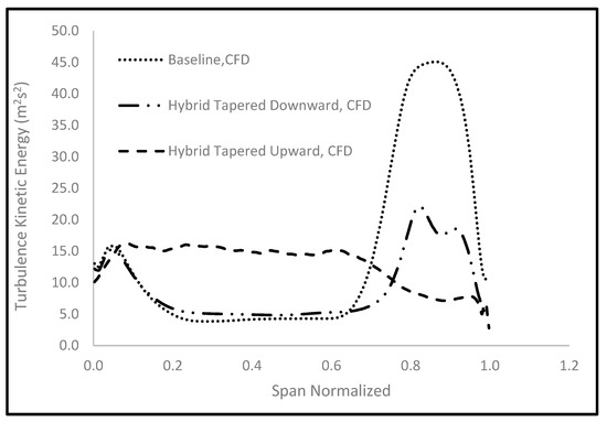 The baseline TKE was the lowest until the normalized span was equal to 0.65. However, the hybrid upward design maintained a constant TKE profile for 0.1 < normalized span . Additionally, there was an increase in turbulence at the near tip of all designs except for the hybrid tapered upward design, i.e., 0.65 < normalized span ; TKE was lower for the hybrid tapered upward than the hybrid tapered downward or the baseline design.