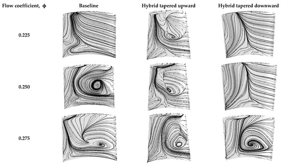 Figure 10 illustrates three designs for different flow coefficients with streamlines at the blade’s suction surface. For example, in the case of the baseline, when the flow coefficient is high (