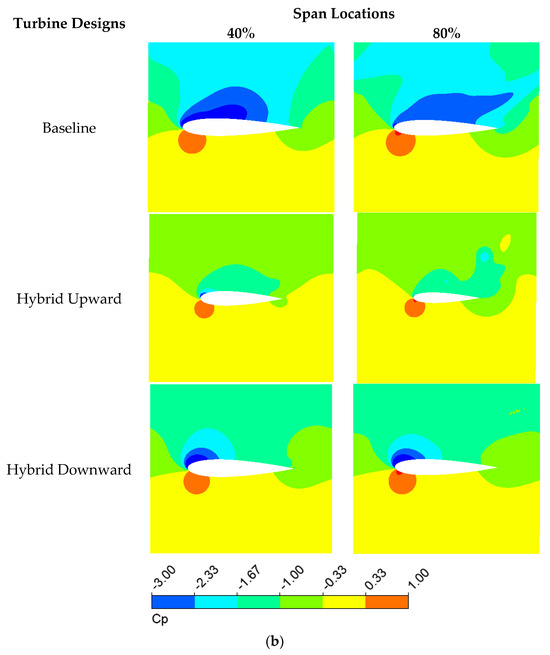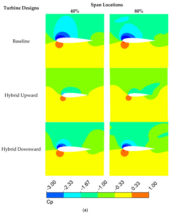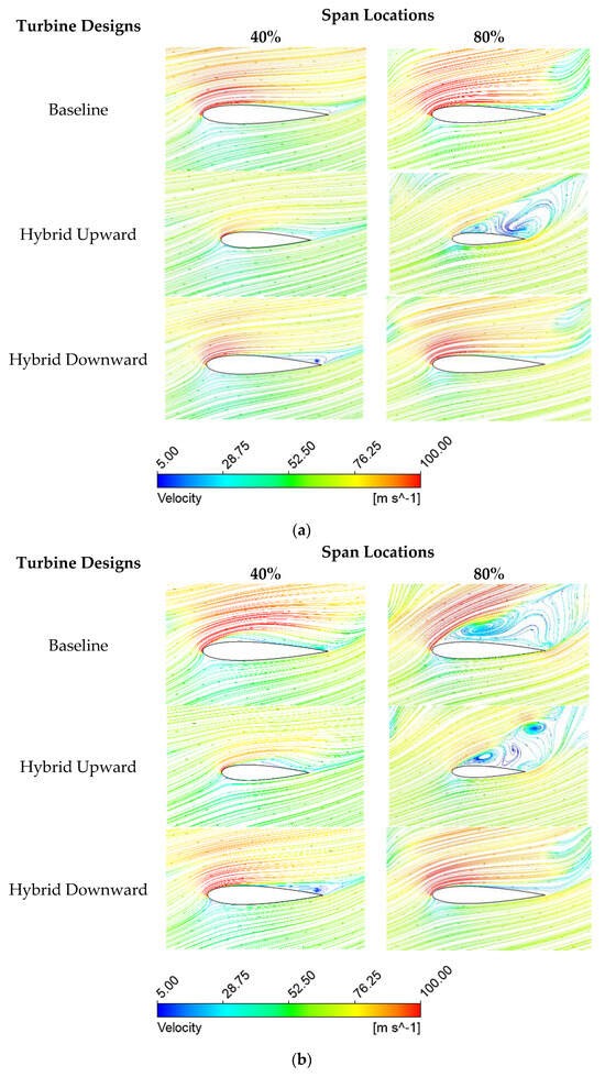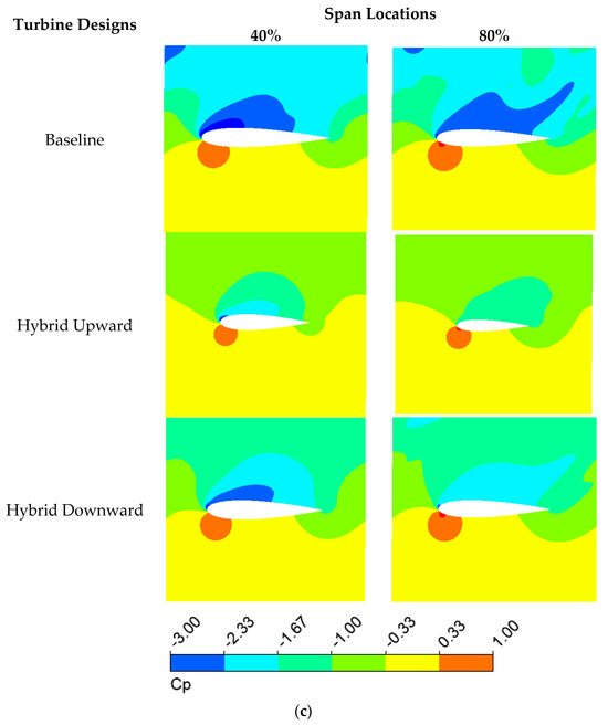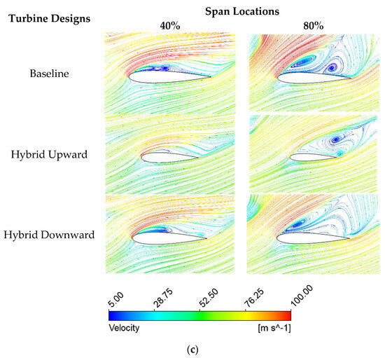 , the baseline has the most prominent high-velocity region corresponding to the largest low-pressure zones over the blade’s suction surface. Additionally, for the baseline and the hybrid downward turbine, the flow remains mostly attached along the blade chord, and there are no appreciable changes in the streamline patterns observed at the 80% span location. However, at the 40% span location, a small vortex is observed near the TE of the hybrid downward turbine blade. On the other hand, the hybrid upward turbine shows evidence of vortex shedding at 80% span. This configuration shows a clockwise vortex near the blade LE and a counterclockwise vortex near the blade TE. However, the streamlines are similar to the other turbines at a 40% span. Additionally, it has the smallest high-velocity regions because of the small low-pressure zones on its suction side. This reiterates that the turbine has stalled and results in a reduction of torque and efficiency.